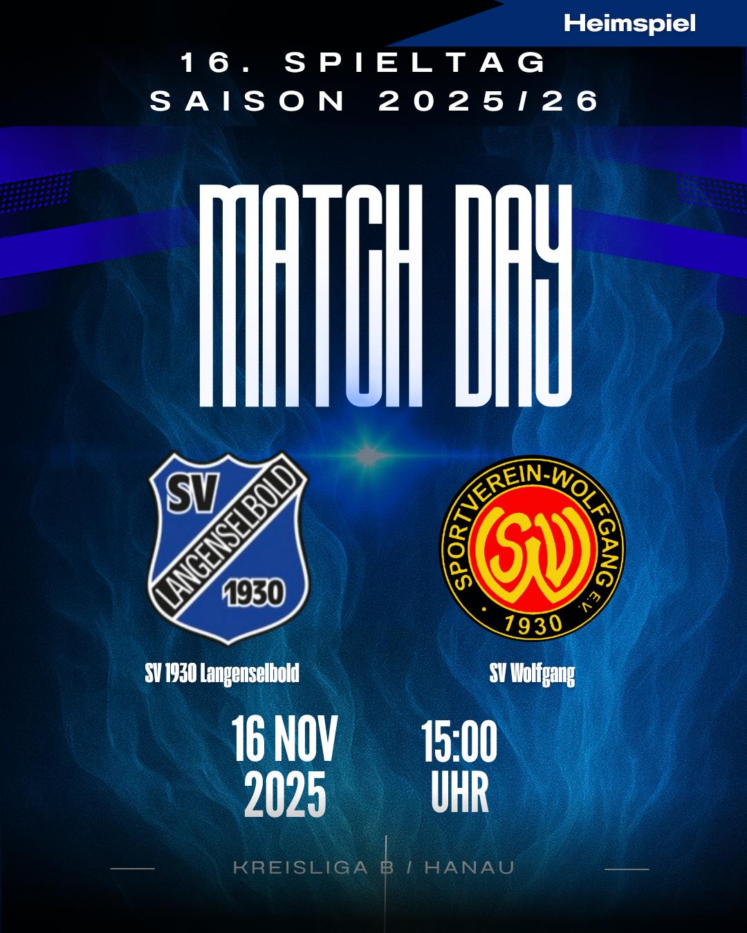 💙🤍 Heimspiel-Sonntag beim SV 1930 Langenselbold! 🤍💙 Am Sonntag, 16. November 2026, erwarten euch gleich zwei Heimspiele unserer Blau-Weißen! Kommt vorbei und genießt einen tollen Fußballtag! ⚽🔥 ⸻ 🕐 13:00 Uhr – SV 1930 Langenselbold II 👉 SV 1930 Langenselbold II vs. 1. FC Mittelbuchen II Unsere Zweite will zuhause alles geben – mit eurer Unterstützung geht da was! 💪💙 ⸻ 🕒 15:00 Uhr – SV 1930 Langenselbold I 👉 SV 1930 Langenselbold vs. SV Wolfgang Es erwartet euch ein spannendes Spiel – für unsere Jungs steht Spaß, Spannung und echtes Teamgefühl im Vordergrund. 🤍⚽ ⸻ 🍺🥨 Für euer Wohl ist gesorgt – kommt vorbei, feuert an und macht den Sonntag blau-weiß!